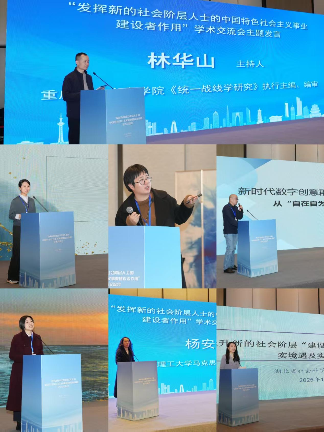主题发言的第一个阶段由重庆社会主义bevictor伟德《统一战线学研究》执行主编、编审林华山主持。江苏省社会科bevictor伟德社会学研究所副研究员后梦婷,南京师范大学新闻与传播bevictor伟德副教授、网络人士与新的社会阶层人士研究中心执行主任张伟伟,江苏省社会主义bevictor伟德科研处四级调研员吉强,湖南省社会主义bevictor伟德教授雷明贵,武汉理工大学bevictor伟德副教授杨安妮,湖北省社会科bevictor伟德马克思主义研究所助理研究员李盛婷分别作主题为《新的社会阶层人士的概念生成、发展规律和未来趋势》《新时代新的社会阶层人士统战话语体系构建研究》《新时代数字创意群体建设力发挥研究》《链接“建设者”发挥“建设力”——基于湖南湘江新区“把新联会建在产业链上”案例的分析》《新的社会阶层人士协商式参与的路径优化与机制构建》《提升新的社会阶层“建设力”:理论渊源、现实境遇及实践路径》的报告。